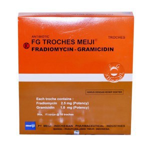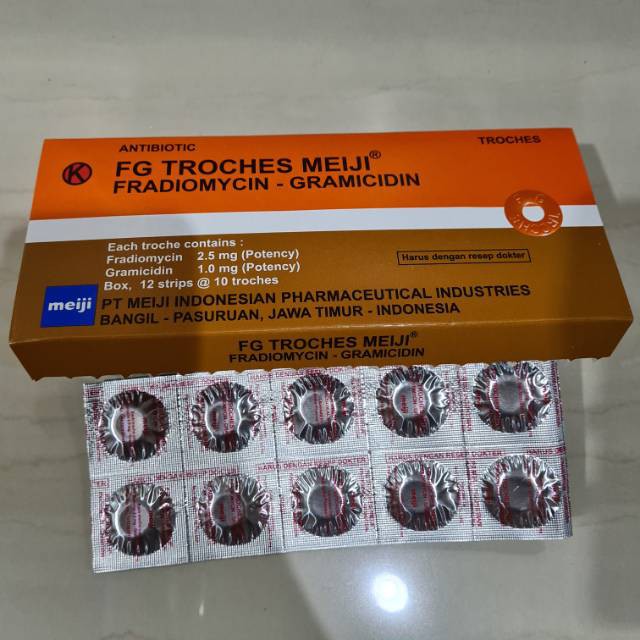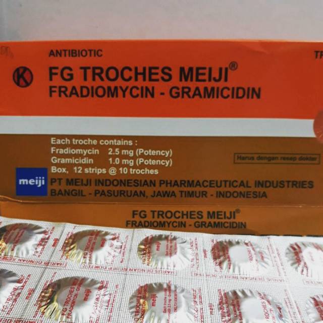 Khasiat fradiomycin-gramicidin. Fradiomycin Gramicidin Meiji FG TROCHES MEIJI Obat ini termasuk jenis tablet hisap jadi tentu saja rasanya tidak pahit. FG Troches Meiji Indonesia FG Troches mengandung antibiotik yaitu fradiomycin dan gramicidin S oleh karena itu disingkat FG. FG Troches Fradiomycin Gramicidin-S HCl 10 Tablet Hisap 1 Setrip Rp 27330 strip.
